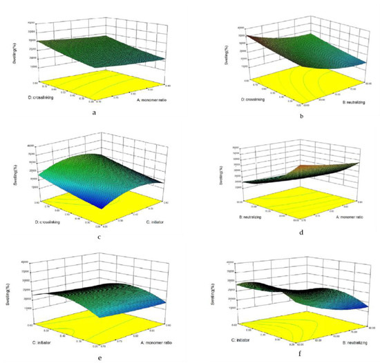 The influence of various factors on the response value in the response surface three-dimensional graph. The z-axis coordinate of six graphs is swelling (%). The horizontal and vertical coordinates are variables: (a) monomer ratio and crosslinking; (b) neutralizing and crosslinking; (c) initiator and crosslinking; (d) monomer ratio and neutralizing; (e) monomer ratio and initiator; (f) crosslinking and initiator.