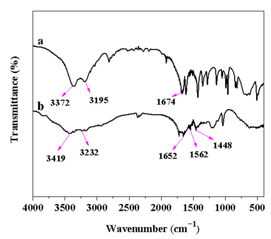 In the infrared spectrum of AM (Figure 3a), the strong absorption bands of amide groups are observed at 3372 and 3195 cm−1. In the case of PAM/AA/[Vim]Br2 hydrogel (Figure 3b), the strong absorption peaks of amide groups have shifted to 3419 and 3232 cm−1. Additionally, the C=O stretching vibration absorption peak at 1674 cm−1 in the AM infrared spectrum corresponds to the C=O stretching vibration absorption peak at 1652 cm−1 in the PAM/AA/[Vim]Br2 hydrogel. The peaks observed at 1562 and 1448 cm−1 in the hydrogel correspond to the C=O stretching vibration peaks of the carboxyl anion (-COO-) in AA. These data indicate the successful copolymerization of AA and AM [38], resulting in the synthesis of PAM/AA/[Vim]Br2 hydrogel.