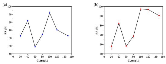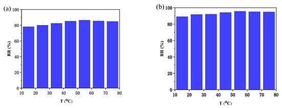 (a) Effect of temperature on RR (%) (40 ppm); (b) 100 ppm.