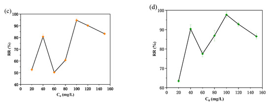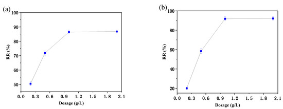 The effect of the added amount of hydrogel on RR (%) is shown in Figure 6. The results showed that at low concentration (40 ppm) or high concentration (100 ppm), RR (%) increased sharply with the increase in hydrogel dosage, which mainly increased the surface area and active sites of hydrogel. When the hydrogel dosage was 2 g/L, the RR (%) value reached 86.4% at a low concentration. When the concentration was high, the RR (%) value reached 91.8%. However, when the hydrogel dosage was 1 g/L, the saturation phenomenon appeared, and the RR (%) increased slowly with the increase in hydrogel addition. Therefore, 1 g/L was selected as the best dosage for further adsorption experiments.