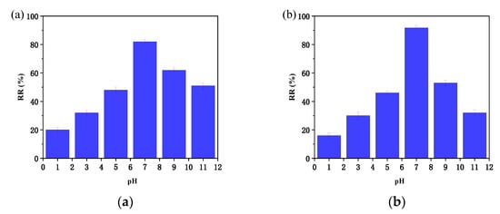 Figure 8 illustrated the RR (%) of PAM/PAA/[Vim]Br2 hydrogel (40 ppm, 100 ppm) for heavy metal ions (NiII, CuII, ZnII, CrIII) in solutions with different pH values. The RR (%) peaked at pH 7, while it significantly decreased in strong acid (pH = 3) or strong alkaline (pH = 11) environments compared to the neutral environment. This was because, in acidic conditions, H+ protonated the -COO− and -NH2 groups on the hydrogel structure, forming -COOH and -NH3+. The H+ ions also competed with heavy metal ions for adsorption sites. As the solution pH gradually increased to 7, the competitive effect of H+ ions weakened, allowing a large number of -NH2 and -COO− groups to re-coordinate with heavy metal ions, resulting in an increase in the RR (%) [39]. However, when the solution pH was above 7 and gradually increased to a strong alkaline environment, the increased OH− ion concentration in the external solution led to an anion shielding effect on the -COO− and -NH2 groups of the hydrogel structure. This caused a decrease in osmotic pressure inside and outside the hydrogel network, hindering the effective diffusion of heavy metal cations into the hydrogel. As a result, the RR (%) decreased [40].