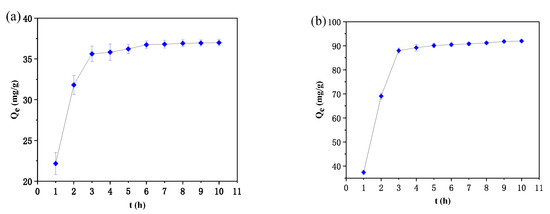 (a) Adsorption kinetics curves of PAM/AA/[Vim]Br2 hydrogels for heavy metal ions (40 ppm); (b) 100 ppm.