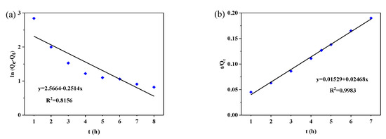 where t is the adsorption time (min); Qe and Qt are, respectively, the adsorption capacity of PAM/AA/[Vim]Br2 hydrogel for heavy metal ions when adsorbed at equilibrium time and t (mg/g); K1 and K2 are quasi-one- and quasi-two-stage adsorption rate constants, respectively.