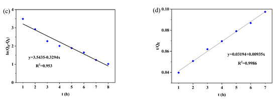 Fitting results of adsorption kinetics of NiII by PAM/AA/[Vim]Br2 hydrogel. (a,b) The first-order kinetics and second-order kinetics fitting results of 40 ppm, respectively; (c,d) 100 ppm.