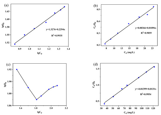 Fitting results of adsorption isotherms of NiII for hydrogel PAM/AA/[Vim]Br2 hydrogel. (a,b) The Freundlich adsorption isotherm and Langmuir adsorption isotherm fitting results of 40 ppm, respectively; (c,d) 100 ppm.
