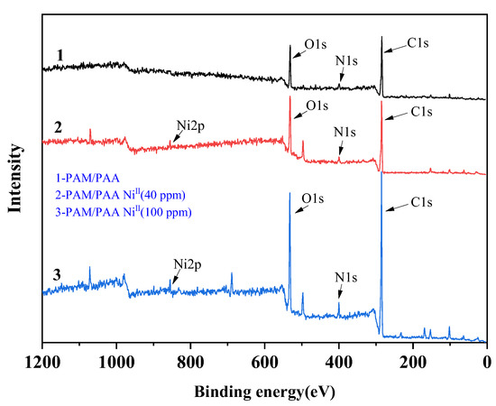 In Figure 12, the main elements of the hydrogel such as the binding energy peaks of C1s, O1s, N1s can be seen. The Figure 12 (2) and (3) curves exhibit that the binding energy peak of Ni2p appears after adsorption, which proves that the NiII was adsorbed by the hydrogel. As shown in Figure 13a, in the PAM/AA sample before the adsorption of the NiII ions (40 ppm, 100 ppm), the N1s spectrum showed distinct peaks at ~399.6 eV and ~401.65 eV, corresponding to the -NH2 or -NH or C-NH3+ groups [43]. In the O1s range, the spectrum showed a distinct peak at ~531.75 (Figure 13d) [44,45], corresponding to the oxygen of C=O or C-O. After the adsorption of the NiII ions, the N1s spectrum shows no significant changes (40 ppm) (Figure 13b), however, the binding energy peaks of the N1s move from 399.65 eV to 399.95 eV and 401.65 eV to 402.45 eV (100 ppm) (Figure 13c). The O1s peak shifted slightly from 531.75 eV to 531.85 eV (40 ppm) (Figure 13e) and the O1s peak shifted strongly from 531.75 eV to 532.2 eV (100 ppm) (Figure 13f). In addition, Figure 13g (40 ppm) and Figure 13h (100 ppm) show the XPS spectrum of Ni2p with a binding energy ranging from 849.1 eV to 886.2 eV. Two major peaks with binding energies of 855.9 eV and 870.6 eV have a significant corresponding relationship to NiCl2, and the peaks of Ni2O3 are found at 865.7 eV and 873.1 eV (40 ppm) (864.9 and 874.4 (100 ppm)), which indicates that the PAM/PAA hydrogel can effectively offer O element as a chelating group for removal of NiII [46]. The other two peaks at 860.5 eV and 879.6 eV (40 ppm) (860.5 and 879.6 (100 ppm)) can be assigned to the corresponding satellite peaks of Ni 2p3/2 and Ni 2p1/2 [47]. The XPS spectra indicate that the concentration of heavy metal ions was low (40 ppm), and the adsorption of heavy metal ions by the hydrogel was mainly physical adsorption, which was the electrostatic attraction between ionic liquids and heavy metal ions. When the concentration of heavy metal ions was high (100 ppm), the adsorption of heavy metal ions by the hydrogel was mainly chemical adsorption, which was due to the chelation and coordination reaction of heavy metal ions with the amino, hydroxyl, and carboxyl groups of the hydrogel. The conclusion was consistent with the adsorption isotherm of hydrogel.