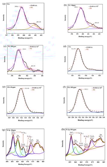 (a–c): XPS spectrum of N1s with PAM/AA hydrogel adsorbing NiII ions (0, 40, 100 ppm). (d–f): XPS spectrum of O1s with PAM/AA hydrogel adsorbing NiII ions (0, 40, 100 ppm). (g,h): XPS spectrum of Ni2p (40, 100 ppm) with a binding energy ranging from 849.1 eV to 886.2 eV (The black line represents the test line, the red line represents the fitting line, and other colors represent reference lines).
