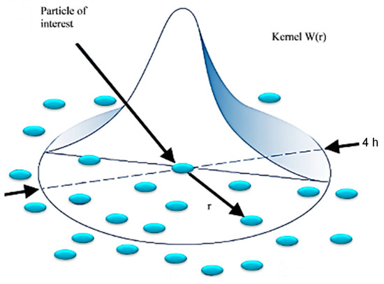 A representation of kernel (W) function in the smoothed particle hydrodynamic model.