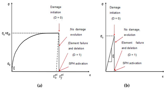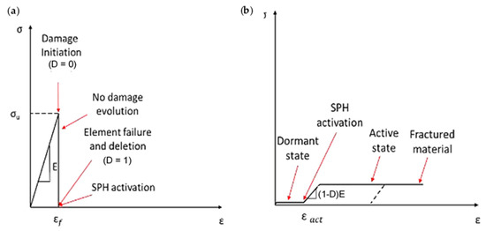 An FEM-SPH model consisting of multiple parts was developed, and a subroutine was created to handle the process. The first part involves computing the coordinates of each finite element’s centre and generating SPH particles, ensuring that each FE has an SPH at its centre. The second part links material property models describing the composite material’s constitutive behaviour. The FEM model represents the material from the beginning of the simulation to failure, while the SPH model represents the post-failure behaviour. The VUMAT and VUSDFLD subroutines are employed to compute the connectivity matrices and apply the failure criteria. When a finite element fails, the corresponding SPH changes from dormant to active, and the particle’s stiffness properties are set to a low value to avoid affecting the simulation. However, the material properties are assigned to the SPH if elements fail, and the stiffness degradation is performed to simulate the fractured elements (see Figure 3a). The matrix constitutive behaviour used in the FEM-SPH model differs from the literature models, and a cutting speed of 18.33 mm/s was employed, causing a strain rate increase that affects the matrix stress–strain curve. The matrix was modelled as perfectly elastic until the occurrence of failure, and the fractured material’s constitutive behaviour was employed in the VUMAT subroutine (see Figure 3b). The degradation of material properties is conducted to simulate the behaviour of fractured material. For the matrix material, damage occurs when it reaches a critical stress value called σu. When damage initiates (D = 0), the element fails and is immediately deleted, with no further damage evolution during the finite element (FE) regime. This is depicted in Figure 3b. At this stage, the smoothed particle hydrodynamic (SPH) method takes over, and the deleted elements are replaced with SPH particles. The damage then continues to evolve during the SPH regime until the material fractures completely, which marks the termination of the material. There is no transitional phase between the FE and the SPH regimes.
