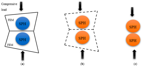The position and deformation of particles under compression loading in (a) dormant, (b) activated SPHs, and (c) SPH deformation.