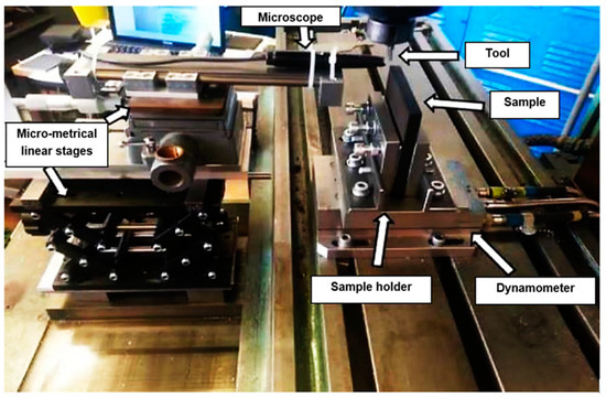 Several studies have used a milling machine in which the tool spindle is locked and the sample is translated with the table [50,51]. For this investigation, Cincinnati milling was employed for machining, with a stationary tool holder and the workpiece moving along a translational path, as shown in Figure 6. To measure cutting and thrust forces during machining, a dynamometer (Kistler tri-axial) was used [51,52,53]. To vertically place the samples on the Kistler dynamometer, a custom-designed holder was created, as described in Kahwash et al. [54] (Figure 6). To study chip types and formation mechanisms, a Supereyes@ digital microscope (Guangzhou, China) was employed to capture photos during the cutting at a rate of 15 f/s. The microscope was placed on the side of the sample facing the area of contact between the cutting tool tip and the sample. It was mounted on three linear stages and equipped with LED. It was also connected to a computer to capture images. Data were collected for the smallest cutting speed within the considered range (12 mm/min) for various fibre orientations, cutting depths, and rake angles. The T800S/HexPly® M21 carbon fibre/resin matrix composite material, consisting of pre-impregnated sheets with a thickness of 0.26 mm matching the fibre diameter of 7.5 microns and a fibre volume percentage of 60%, was prepared; several steps were implemented to enhance the process [55,56]. Initially, the pre-impregnated carbon fibre was meticulously cut into the desired dimensions using a sharp cutter, while ensuring a pristine and uncontaminated work surface through thorough cleaning. Subsequently, a plywood sheet was carefully positioned on the processing table and shielded with release film, followed by the layering of breather fabric and T800 pre-impregnated carbon fibre. To maintain uniformity in the fibre alignment, pen markings were used to indicate the orientation of the fibres, repeating this procedure until the desired number of layers was achieved. Finally, the fabrication of laminates was accomplished, with each layer set to specific fibre orientations of 0°, 45°, 90°, and 135°, respectively.