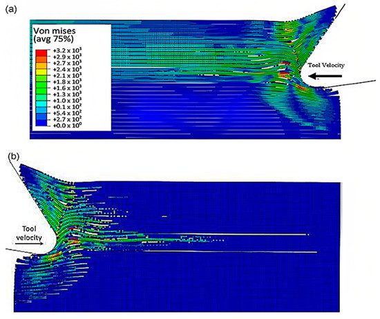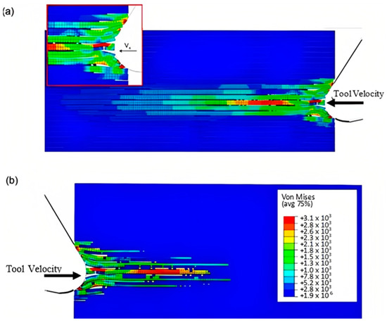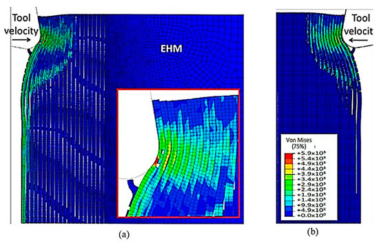 The comparison of the two models is more evident in Figure 17 when the time step is 1.09 × 10−2 s. Even though both models generate continuous chips, the hybrid model produces a larger chip than the FEM because there is more material near the cutting edge that prevents the tool from losing contact with the workpiece and avoids separation. The thrust force that occurs is caused by the pressure from the material acting on the clearance face. Additionally, the SPH model has the capability to predict and simulate the bounce-back phenomenon. When the material particles fail, they interact with the remaining SPH particles based on the assigned constitutive model, creating a cracked material that can undergo elastic recovery.