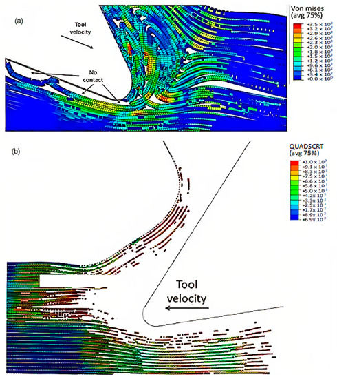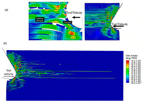 To accurately analyse element failure, it is crucial to have a clear understanding of the workpiece and limited contact of the clearance face. This phenomenon can have significant implications on the overall process, so it must be carefully observed and acknowledged, as shown in Figure 12a. The configuration of cohesive elements after the analysis is displayed in Figure 12b, and the QUADSCRT variable provides crucial information about the damage initiation condition and which cohesive elements are damaged but have not failed yet. Two primary factors contribute to the clumping of fibres in front of the cutting tool, ultimately leading to the failure of cohesive elements. Firstly, a matrix failure causes the deletion of linked cohesive elements. Secondly, extensive deformation of fibres causes cohesive elements to stretch until they break, resulting in debonding between the matrix and fibre. Cohesive FE elements located near the fibre agglomeration are more likely to fail as the tool advances. Therefore, appropriate measures must be taken to prevent any potential problems. It is essential to understand that the breakdown of cohesive components in the compressed area under the cutting plane is strongly connected to the collapse of the matrix and must be considered during the analysis. Thus, understanding this phenomenon is critical to optimize the process and ensure a successful outcome.