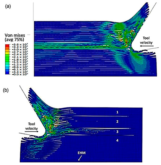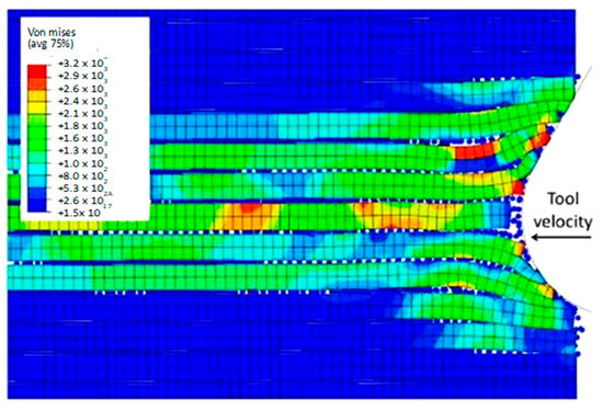 As the tool advances further, at a time of 4.5 × 10−3 s, the fibre’s buckling instability leads to the failure of fibres ahead of the tool and results in multiple fractures, as shown in Figure 10. The cutting area expands, causing the material to bend and slide along the tool’s rake face, while the compression zone below the tool also widens, and the matrix fracture may even extend to the EHM phase. To gain an understanding of the matrix failure within the material, a more comprehensive model is required. Based on the material deformation, the sample can be split into four horizontal strips. Strips one and four exhibit primarily fibre bending behaviour, while strips two and three experience mostly buckling. However, the fibre behaviour tends to shift towards bending as we move towards strips one and four.