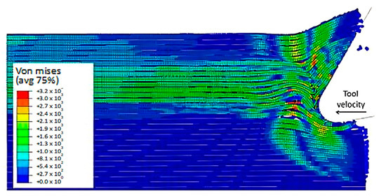 The finite element model in Figure 7 depicts the configuration 5.77 × 10−4 s after the start of cutting. The tool’s advancement compresses fibres at the tip, causing the central fibre to buckle under axial force. Adjacent fibres bend and deflect on the rake face due to the opening force applied by the tool. Stress propagation extends beyond the tool, leading to brittle failure in the matrix around the tool and along the fibre direction due to significant fibre deformation. This effect is evident in the buckling of the central fibre.