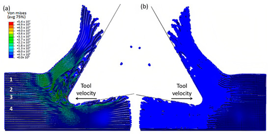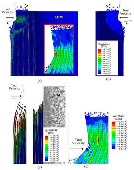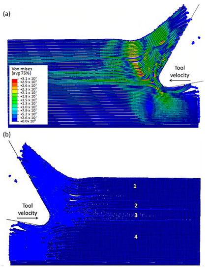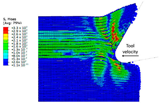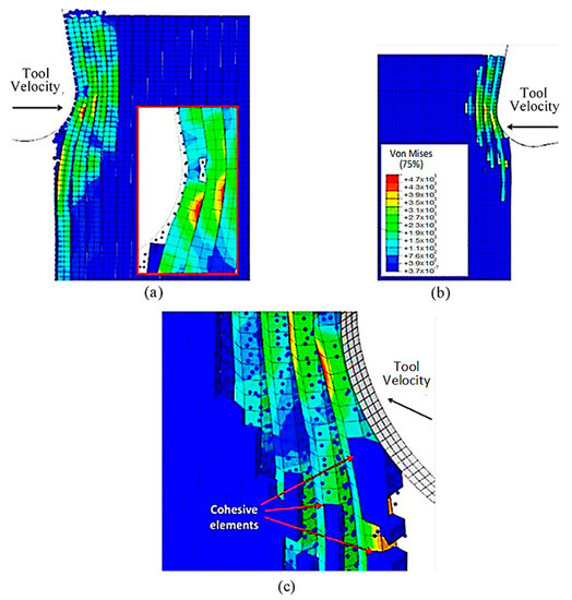 At 4.527 × 10−3 s, as shown in Figure 16, the hybrid model demonstrates a similar agglomeration of fractured fibres and the matrix as the FEM. However, in contrast to the FEM model, the failed matrix elements in the agglomeration were clearly shown in the hybrid model. The area located in front of the tool can be categorized into four separate strips, with strips one and four exhibiting bending of fibres and strips two and three showing primarily buckling. Additionally, the tool’s movement causes the SPH particles to accumulate around the cutting edge.