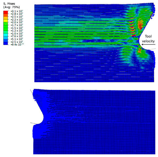The model’s configuration at 2.84 × 10−3 s is depicted in Figure 9. As the tool moves forward, the fibres above the cutting edge undergo a considerable bending deformation, resulting in the propagation of cracks towards the sample’s free surface through adjacent fibres. An axial load in front of the cutting tool results in an increase in deformation, which damages the fibres located under the cutting plane. This damage is visible in the form of cracks caused by compression. Furthermore, there is a significant rise in the matrix fracture, mainly near the tool, where most of the matrix elements are eliminated as they fail.