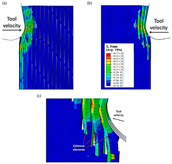 Figure 22a,b exhibit a noticeable contrast when compared with previous models. In particular, only a small portion of fibres in front of the tool experience buckling failure, while most of them undergo bending deformation. This results in the formation of a smaller agglomeration, which remains in close proximity to the tool tip. The study indicates that fractured material has a higher stiffness, enabling it to bounce back more due to a greater volume of material in contact with the clearance face of the cutting tool. Figure 22c displays the final configuration of cohesive elements, which depicts a wider region with failed cohesive elements in comparison with the FEM model shown in Figure 12b. Additionally, there are failed cohesive elements in the formed chip. Due to the failure of the matrix finite elements, most of the cohesive elements experienced failure beneath the cutting plane. Hence, it can be inferred that the damage extends beyond the area of the micro-mechanical model. Therefore, it is recommended to incorporate a greater number of fibres in the model to assess the extent of the damage.