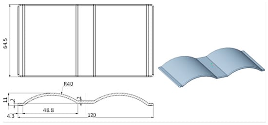In previous studies on mold-temperature control for injection molding [42,43,44,45,46,47], the straight cooling channel was used with different heating methods. However, more realistic products will have many complex cavity-surface geometries. Therefore, the distance between the cooling channel and the cavity surface will vary. This issue will lead to different heat transfer rates from the hot-melt plastic to the wall of the cooling channel, resulting in an imbalance of temperature at the cavity surface. Thus, to mitigate this problem, the CCC was suggested for balancing the heat transfer from the cavity surface to the cooling channel, which will lead to improved temperature distribution on the cavity wall surface and machine part temperatures. The products in Figure 1 with a plate and wave profile were chosen for the experiment in a previous study concerned with optimizing the cooling channel shape. The wave profile resulted in a non-uniform mold thickness; therefore, using a straight cooling channel will result in unbalanced temperature distributions for this product geometry.