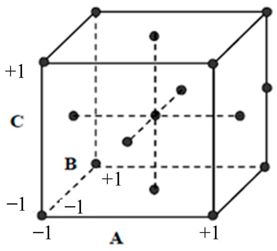To find the regression equation coefficients, the figure of variables and responses throughout each experiment was used. Design of experiments (DOE) is an efficient experimental strategy for determining the relationship between variables and responses. The most widely accepted experimental designs are full and fractional factorial, with the number of levels depending on the relationship between variables and responses. A complete factorial design consists of all possible combinations between each level of the variables. Therefore, the number of experiments observed from a complete factorial design is numerous, especially in the case of many variables. In this study, with the number of variables being seven and the number of levels being three, the number of experiments observed from a complete factorial design could be 37 = 2187. Instead of a complete factorial design, a fractional factorial design could be a compelling DOE for this study. There are two primary types of DOE for response surface designs: central composite design (CCD) and Box–Behnken design [48,49,50,51]. The Box–Behnken design has fewer experimental design points than the CCD design and only supports up to three levels of each variable. However, the CCD design has to run more experimental trials than the Box–Behnken. However, the disadvantage of this type of experiment is that some design points are located at the axis, making it impossible to experiment because it is beyond the upper or lower value of the variable. To prevent this, face–center design experiments have been developed. This parameter is a variant of CCD, where α = 1. The schematic of the face-centered design can be derived from Figure 6. In this study, the face–center design has been used to implement the experiments. Each variable was separated into three levels, and the number of experiments was 143.