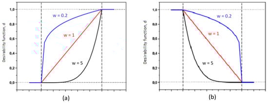 The value of the weight when describing the expected function will determine the shape of the graph representing this function. When we choose a weight larger than 1, we emphasize the importance of attaining an objective function close to the desired value. Conversely, when the weight is less than 1, we extend the acceptance more when the objective function is far from the desired value. Figure 7 shows the desirability of the maximum and minimum optimization when the weight of each response is 0.2, 1, and 5.