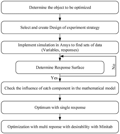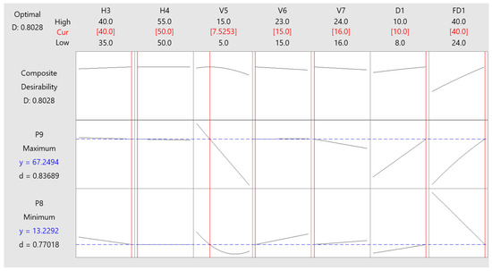 In this study, the P8 (temperature difference) optimized object was depreciation, and the P9 (average temperature) optimized object was maximization. The optimization process is illustrated in the figure. A regression equation based on the CCD method was used to find the optimum point. The optimization process with the desirability function approach could be easily solved using an added tool such as Minitab, and the progress is shown in Figure 8.