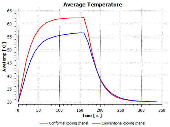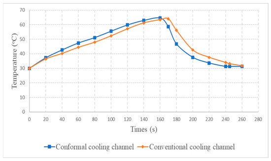 During the heating step, Figure 16 and Figure 17 show that when comparing the simulation and experimental results, the deviation between these two results does not vary much. Specifically, within the straight cooling channel mold, the simulation results for the average and maximum temperature were 63.01 °C and 66.8 °C, respectively, whereas the experimental results for those parameters were 64 °C and 67.8 °C. With the CCC mold, the simulation result nearly matched the experimental results. In the simulation, the average and maximum temperatures were 66.72 °C and 72.07 °C, respectively, and the experiment yielded 64.6 °C and 68.4 °C, respectively. The deviation between the simulation and the investigation was insignificant. The straight cooling channel mold was from 1 °C to 3.3 °C, whereas the CCC mold temperature deviation was from 2.12 °C to 4 °C. This error can be readily accepted because of the differences between experimental and simulation conditions, such as environmental effects, machining-modeling errors, and mold material variations. In addition, the material properties do not perfectly conform to the ideal material used in the simulation, and all these factors are attributed to the observed variations.