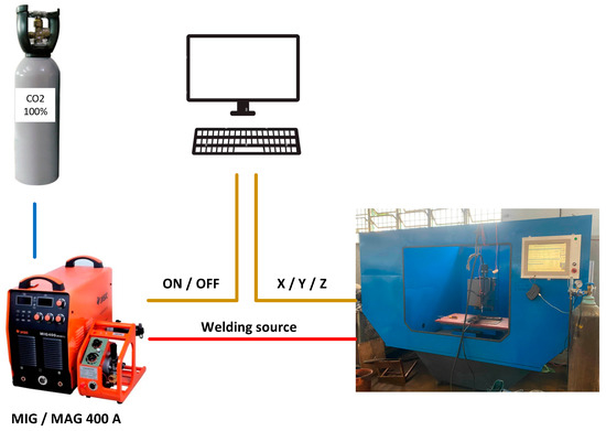 Recently, additive manufacturing (AM) has emerged as a promising manufacturing method that, in many cases, could replace traditional manufacturing methods [1,2,3]. The original material shapes for the AM method are powder or wire, and they are melted and adhered to generate the designed forms. Powder materials require a laser beam or electron beam, which are expensive and high-energy consumption devices, despite the fact that they could build high-resolution parts [4,5,6,7,8]. Compared to powder materials, wire shapes have the merits of saving fusion energy and time during the additive process. Significantly, the metal wire could create high mechanical characteristics that could be applied in marine, aerospace, and automobile industries [9,10,11,12].