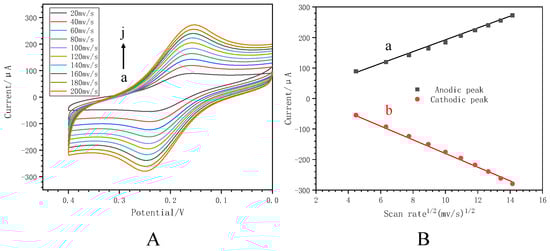 The electrochemical behavior of the MNS. (A) CVs of the MNS at various scan rates (a–j: 20, 40, 60, 80, 100, 120, 140, 160, 180, 200 mV s−1). (B) Relationship between the (a) anodic and (b) cathodic peak currents and the square root of scan rate.