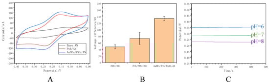 Electrochemical performance of the proposed MNS. (A) CV response of the bare AN, Ptb/AN and AuNPs/Ptb/AN in 5 mM K3Fe(CN)6 solution containing 0.1 M KCl. (B) The voltage difference between the open circuit voltage (pH = 6 and pH = 8) detected by bare PANI/AN, PANI/Ptb/AN and PANI/AuNPs/Ptb/AN. (C) The open circuit voltage of pH buffer solutions (pH = 6, pH = 7 and pH = 8) detected by the MNS.