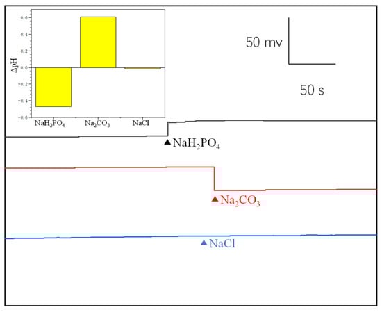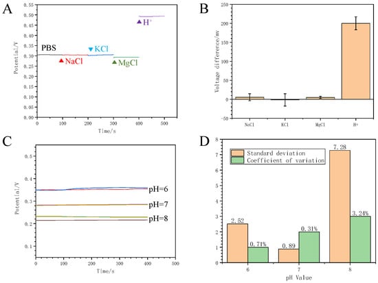 Selectivity is a crucial property for biosensors, especially for a sensor that is about to be applied in blood. The selectivity of the proposed MNS was evaluated by investigating by the interference of Na+, K+ and Mg+ with H+. Since these ions are commonly present in blood, it is crucial to assess the sensor’s selectivity in the presence of these interferences. The proposed MNS was exposed to 2 mM NaCl, 2 mM KCl, 2 mM MgCl2 and 100 μM H+ solutions, and the open circuit voltage changes were monitored through OPCT. As shown in Figure 7A, the addition of NaCl, KCl and MgCl2 resulted in minimal changes in the open circuit voltage. However, when the H+ was added at a concentration one-twentieth of the aforementioned solutions, a significant increase in the open circuit voltage was observed. Figure 7B further illustrates the impact of different ions on the open circuit voltage measured by the proposed MNS. The changes in open circuit voltage caused by Na+, K+ and Mg+ were only 2.75%, 0.75%, and 2.5% of that caused by H+, indicating excellent selectivity of the proposed MNS.