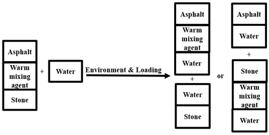The adhesion failure process with moisture of the three-phase model is complex. The interfacial failure caused by water may occur at two interfaces. One is the warm-mixing agent–asphalt interface, and the other is the warm-mixing agent–aggregate interface, as shown in Figure 2. Assuming a 50/50 split between the two scenarios, the formula of adhesion with moisture is calculated as Equation (5), and ER can be calculated as Equation (6).