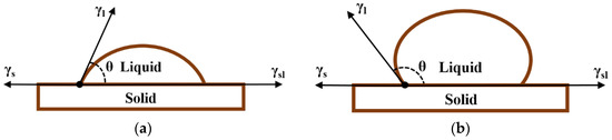 where represents the contact angle between the test solid and known liquid; and represent the surface free energy of solid and liquid, respectively, mJ·m−2; represents the solid–liquid interface energy, mJ·m−2; represent different known liquids.