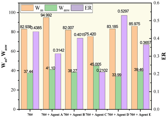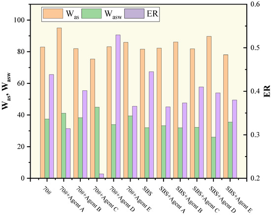 The ranking based on the calculation of the three adhesion indicators was different. The results ranked by the Was were A > E > D > B > C, while those by the Wasw and ER were D > B > E > A > C. The difference emerged due to the consideration of the effect of moisture. When lacking the consideration of water, agents A and D were able to promote the adhesion as the value announced, while all the agents deteriorated the adhesion when moisture was taken into account as and ER, with oil-based warm-mixing agent D having the least effect.