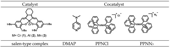 Limonene oxide is a bio-renewable monomer obtained from non-food materials and derived from limonene, a naturally occurring terpene that is available in large amounts in the peel of many citrus fruits. Considering the structural analogies between cyclohexene oxide (CHO) and LO and taking advantage of the results presented in a previous study [23] on the influence of the polymerization conditions on both the molar mass and glass transition temperature in the synthesis of poly(CHO-co-PA), we explored the reactivity of the mixture of cis- and trans-R-LO, the commercially available monomer, in the ROCOP with PA. A series of limonene oxide copolymerizations with phthalic anhydride as the comonomer were performed by the salen-type complexes centered with three different metals, Cr (1), Al (2), and Mn (3), in combination with DMAP, PPNCl, and PPNN3 as cocatalysts, which are the most efficient cocatalysts for ROCOP (Figure 1) [37]. To avoid any protonated impurities that may shorten the polymer chain length by acting as a chain-transfer agent, LO, PA, the cocatalysts and toluene were purified or distilled prior to polymerization as described in Section 2.1 and all experiments were performed under an inert atmosphere [34,38].