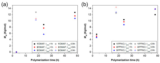 Correlation between molar masses of poly(LO-alt-PA) and polymerization time using salen-type catalysts 1–3 and (a) DMAP and (b) PPNCl as cocatalysts.