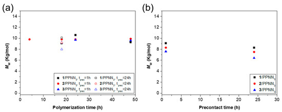 Correlation between molar mass of poly(LO-alt-PA) and reaction time (a) and precontact time for 18 h of polymerization time (b) using salen-type catalysts and PPNN3 as cocatalyst.
