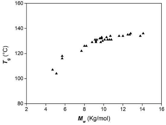 Figure 5 presents the Tg values as a function of molar mass (Mw) for all poly(LO-alt-PA) samples. The trend in the curve consists of an increase up to a limit around the value of Mw = 11 kg/mol, followed by a plateau at which the increase in the Tg according to the molar mass is negligible.