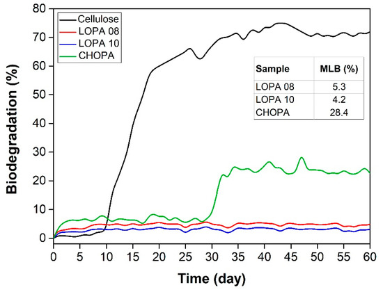 Because biodegradability is one of the properties of these polymers, biodegradability tests were performed according to ISO standard 14851 [36] with the respirometric BOD (biochemical oxygen demand) method [39]. Figure 6 shows the average percentage of biodegradation plotted as a function of time for LOPA 08, LOPA 10, and the positive reference (microcrystalline cellulose). Moreover, the maximum level of biodegradation (MLB) detected within 60 days is reported in the inset of Figure 6. Biodegradation curves are typically characterized by: (i) a lag phase, from the start of the test until clear biodegradation; (ii) a biodegradation phase, where a sharp increase in the average percentage of biodegradation is recorded; (iii) a plateau phase, where biodegradation is almost completed. The degree of biodegradation of the reference sample (cellulose) at the end of the test exceeded the limit value of 60% required by the ISO 14851 to prove the validity of the test [36]. For the LOPA samples, the biodegradation phase was not obvious; for the cellulose, this phase started after 8 days. The curves of LOPA 08 and LOPA 10 almost overlapped, with a plateau phase close to 5%. For comparison purposes, the average percentage of biodegradation of a poly(CHO-co-PA) polyester [23] is displayed in Figure 6. The CHOPA sample showed higher biodegradation (>28%) than the LOPA samples due to a more evident susceptibility to attack by microorganisms. The cause of this difference probably lies in the nature of the chemical structure, a factor that mostly influences biodegradative processes. poly(LO-alt-PA) possesses substituent groups that limit accessibility to ester groups, on whose hydrolysis the degradation of the tested polymeric materials depends.
