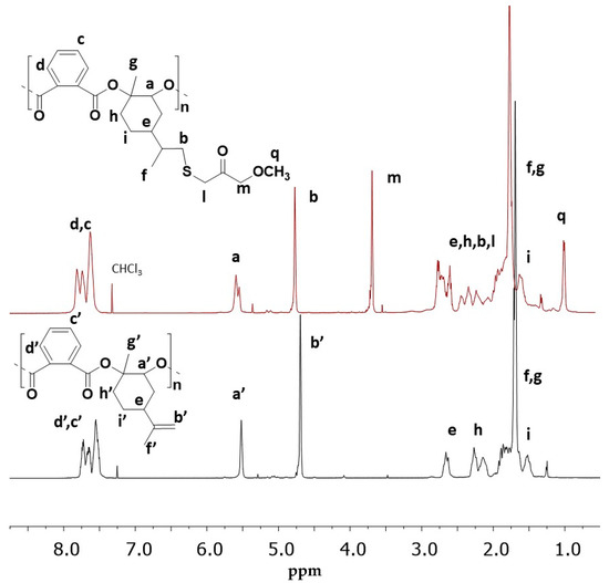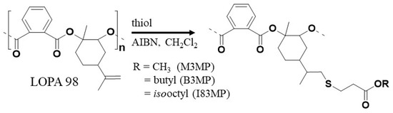 Poly(LO-alt-PA) was dissolved in dry dichloromethane to produce a 2 wt % solution. We added 28 eq of thiol and 0.3 eq of AIBN to the polymeric solution. The solution was kept at reflux for 24 h under stirring. Then, it was concentrated and precipitated in methanol and collected after filtration [35].