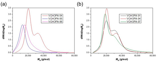 The unimodal and bimodal molar mass distributions (MMDs) of poly(VCHO-alt-PA) synthesized in the presence of the different catalysts 1, 2, and 3 and PPNCl as cocatalysts are shown in Figure 9a. Unimodal poly(VCHO-alt-PA), VCHOPA 05 and 06, with molar masses (Mw) of 13.8 and 10.8 kg/mol, respectively, and dispersity (Đ) of 1.6 were produced using catalysts 2 and 3, respectively, after 1 h of polymerization. A bimodal MMD was observed for VCHOPA 01, 04, and 07 (Figure 9b). The higher molar mass fraction was nearly twofold higher than the lower one. The bimodal distribution is probably caused by hydrolyzed anhydride and/or traces of water acting as chain-transfer agents and causing diversification of the catalytic sites [30,40]. In addition, at high monomer conversions, side reactions such as transesterification and chain-end coupling reactions often occur in the ROCOP between cyclic anhydride and epoxides [31].