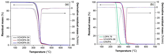 TGA and DTG curves of (a) selected poly(VCHO-alt-PA) polyesters obtained from salen-type complexes and PPNCl; (b) comparison of thermal behavior of LOPA 79, VCHOPA 06, and CHOPA polyesters. Solid lines = residual mass (%); dashed lines = derivative residual mass (%).