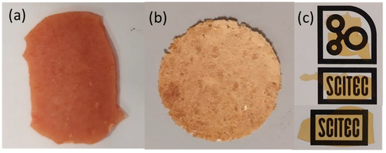 (a) LOPA 102 sheet (2 × 1 × 0.1 cm3), (b) VCHOPA 01 sheet (diameter 2.5 cm, thickness 0.1 cm), and (c) VCHOPA 04 film (thickness 120 µm).
