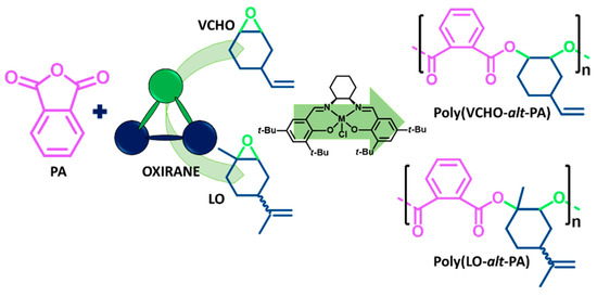 In this respect, the use of terpene-derived epoxides has offered new potential for bio-derived polyesters [7,8,9,10,11] and polycarbonates [12,13,14,15,16], displaying similar or even improved properties compared with conventional fossil-source-derived polymers. In particular, commercially available and inexpensive limonene oxide (LO), the epoxidized form of the highly abundant terpene limonene, is an attractive, readily available, bifunctional, and renewable monomer; its use in polyester production is steadily increasing [17,18]. This increase is mainly due to the development of the ring-opening copolymerization (ROCOP) (Scheme 1) of epoxides and cyclic anhydrides, as an alternative polyester chain-growth route with respect to traditional lactone ring-opening polymerization (ROP) [19,20,21].