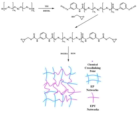 The synthesis route of epoxy−terminated polyurethane and schematic illustration of EPU-modified epoxy network.