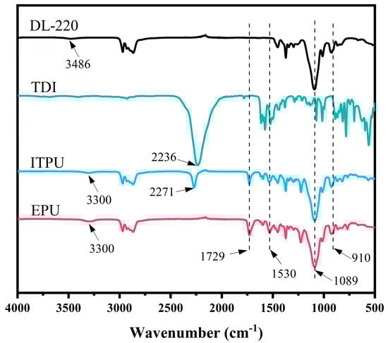 The structures of TDI, DL−220, and EPU were analyzed by FT−IR. Figure 2 presents the FT-IR spectra of DL−220, TDI, ITPU, and EPU. Firstly, the terminal hydroxyl group in DL−220 reacts with TDI to obtain ITPU, so the hydroxyl absorption peak at 3486 cm−1 in DL−220 disappears after the reaction and a new carbamate group (3300 cm−1, 1530 cm−1, and 1720 cm−1) appears. Secondly, the isocyanate group at the end of ITPU reacts with glycidol to obtain EPU. Therefore, after the reaction, the isocyanate absorption peak of ITPU at 2271 cm−1 disappears and an epoxy group (910 cm−1) appears. The results of structural characterization prove the successful synthesis of EPU.