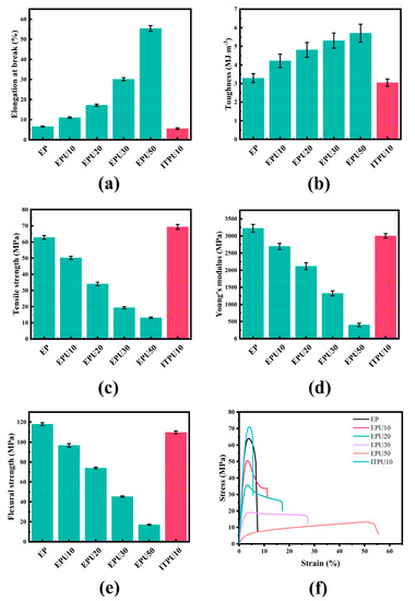 As depicted in Figure 4f, with the increase in EPU content, the yield strength of thermoset materials is decreased. When the ratio of EPU to DGEBA reaches 1:1, the modified resin only undergoes high elastic–plastic deformation without yielding. Plastic deformation is mainly caused by the movement of polymer segments when the crosslinking density of EPU-modified epoxy resin is relatively low. Therefore, the originally frozen segments can begin to move under low stress. Therefore, the yield strength of modified epoxy resin gradually decreases with the increase in EPU content. Young’s modulus reflects the material’s resistance to deformation. Compared to DGEBA containing rigid benzene rings, flexible polyether chains are more prone to deformation under external forces. Therefore, both EPU and ITPU will reduce the Young’s modulus of the material, which is similar to previous research [31,37].