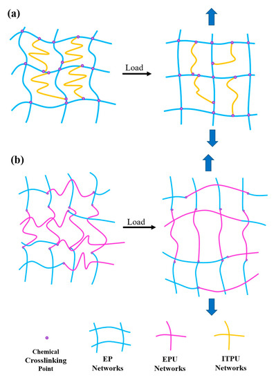 Schematic diagram of the toughening mechanism of (a) EPU and (b) ITPU.