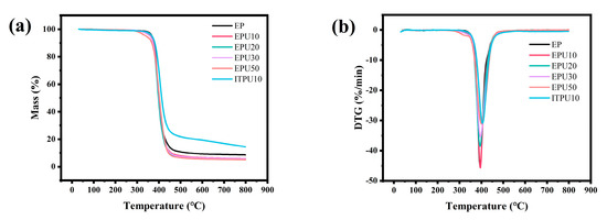 The peak of the DTG curve corresponds to the maximum degradation rate temperature (Tm). The Tm of all samples is similar, and the content of EPU has little effect on Tm. The relatively poor stability of the polyether chain in EPU results in its decomposition at a low temperature. However, since the decomposition temperature of the polyether chain and the aromatic structure in DGEBA are not significantly different, the decomposition of both EPU and DGEBA co-occurs with increasing temperature, resulting in no significant change in Tm [43]. Additionally, EPU contains more hydrogen contents, which leads to a reduction in char residue at 800 °C for the samples containing EPU [44]. However, the char residue does not decrease with an increasing amount of modifier. Therefore, the TGA results suggest excellent thermostability of the modified samples.