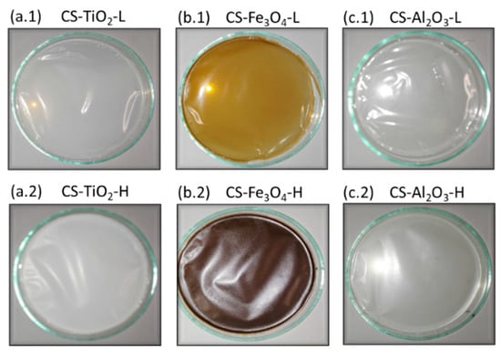 CS membranes prepared with different NPs concentrations: CS-NP-L for low NP concentration (5% w/w of TiO2 (a.1); Fe3O4 (b.1); and 2% w/w for Al2O3 (c.1)) and CS-NP-H for high NP concentration (33% w/w of TiO2 (a.2); Fe3O4 (b.2); and 17% w/w for Al2O3 (c.2)).